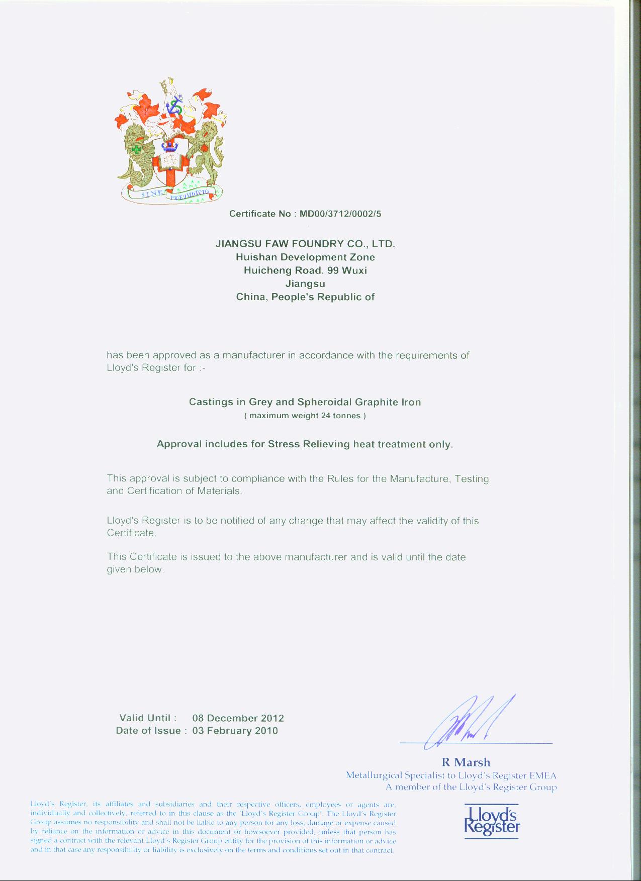 我公司主要從事各種鑄造產(chǎn)品的生產(chǎn)和銷售,已通過(guò)ISO9001,ISO14000和ISO18000體系認(rèn)證,取得挪威DNV、英國(guó)LR、中國(guó)CCS、德國(guó)GL、法國(guó)BV等船級(jí)社工廠認(rèn)證。公司主持起草了GB/T25390—2010《風(fēng)力發(fā)電機(jī)組 球墨鑄鐵件》國(guó)家標(biāo)準(zhǔn);作為主要成員參加GB/T 1348—2009《球墨鑄鐵件》和GB/T9441-2009《球墨鑄鐵金相檢驗(yàn)》的制修訂。公司占地總面積146畝,注冊(cè)資本10000萬(wàn)元。公司從業(yè)人員500人,資產(chǎn)總額63645萬(wàn)元,年產(chǎn)5萬(wàn)噸,具備生產(chǎn)最大單重60噸的大型鑄件的能力。公司具有一批經(jīng)驗(yàn)豐富的研發(fā)工程師和長(zhǎng)期從事鑄造的技師隊(duì)伍,對(duì)產(chǎn)品質(zhì)量有保證。“熔華夏精魂,鑄國(guó)際精品”是公司一貫的品牌理念